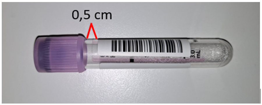 Putkimuutoksen lisäksi myös putken tarroitustapa muuttuu entistä kriittisemmäksi. Oikea tarroitustapa on kuvattu alla. Tarra tulee kiinnittää putkeen suoraan ja sen yläpuolelle korkin alle tulee jäädä tilaa n. 0,5 cm. Tällöin laitteisto tunnistaa näytepinnan oikein ja analysointi onnistuu ilman uudelleentarroitusta.