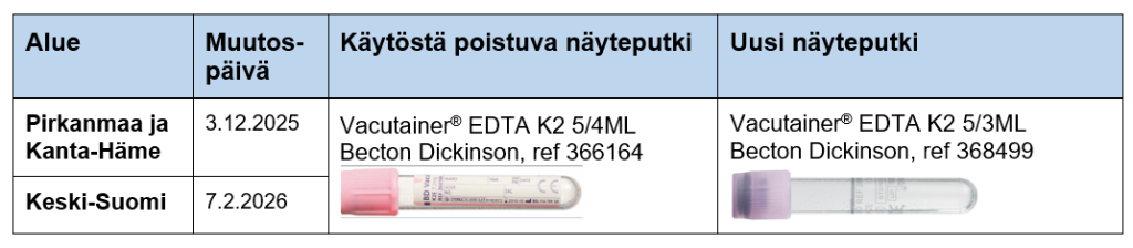 Uudistuksen jälkeen tutkimuksen voi analysoida ainoastaan alla olevassa taulukossa kuvatusta uudesta näyteputkesta, jossa on kirkas etiketti. Paperietiketillistä EDTA-putkea ei saa jatkossa käyttää. Tämän vuoksi käytöstä poistuvat näyteputket on hävitettävä muutosaikataulun mukaisesti kaikista näytteenottopisteistä sekä hoito- ja hoivayksiköistä.