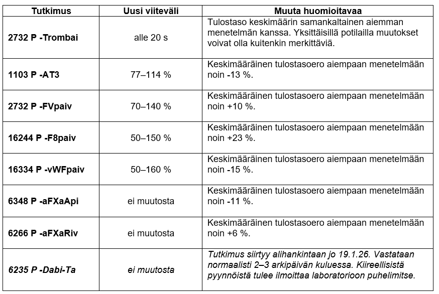 Tampereen keskuslaboratorion hyytymäanalytiikassa käytettävä laitteisto vaihtuu 26.1.2026. Laite- ja menetelmämuutoksesta johtuen viitevälit vaihtuvat osassa tutkimuksista (kts. taulukko). Samassa yhteydessä tutkimuksen 1103 P -AT3 analysointi keskitetään Tampereelle. Tutkimusten nimet ja numerot säilyvät ennallaan, samoin 24/7 saatavuus.