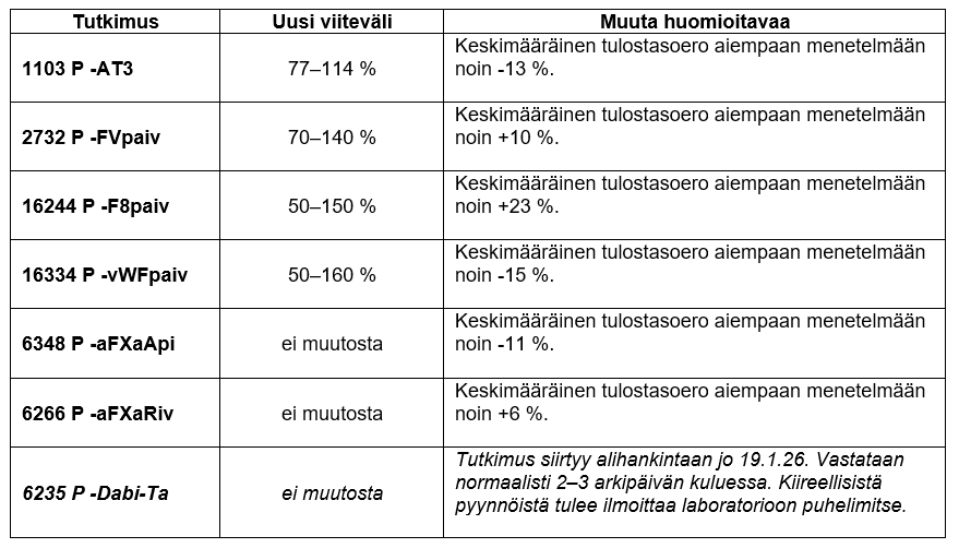 Tampereen keskuslaboratorion hyytymäanalytiikassa käytettävä laitteisto vaihtuu 26.1.2026. Laite- ja menetelmämuutoksesta johtuen viitevälit vaihtuvat osassa tutkimuksista (kts. taulukko). Tutkimusten nimet ja numerot säilyvät ennallaan, samoin 24/7 saatavuus.