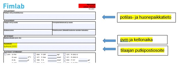 Klo 18 alkaen kaikki laboratoriotutkimuspyynnöt tehdään paperisella tilauslomakkeella: https://fimlab.fi/wp-content/uploads/paivystys-lahete-vastaus-20210319.pdf