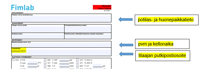 - potilas- ja huonepaikkatieto näytteenottajaa varten