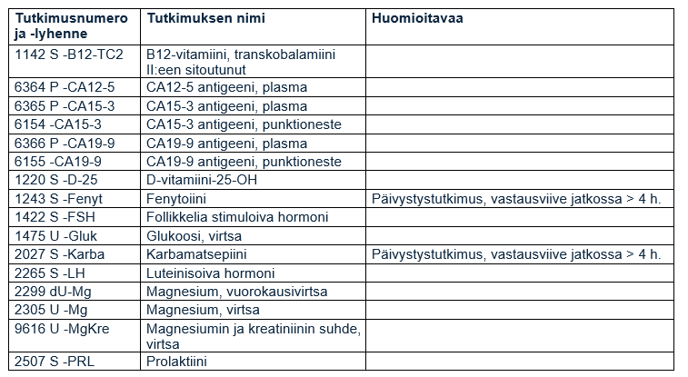 Tarkemmat tiedot tutkimuksista ja niiden tulkinnasta pyydetään tarkistamaan ohjekirjasta Fimlabin Extranet-palvelusta.