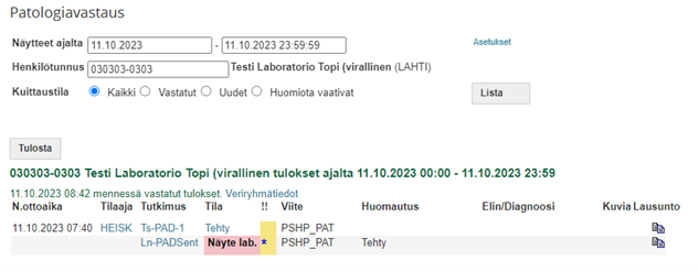Muutoksen jälkeen mahdollinen patologialla tehtävä nimikekorjaus näkyy myös erillisellä rivillä tutkimuksen peruutuksena (vanha nimike) ja vastaus siirtyy uudelle riville uudelle nimikkeelle.