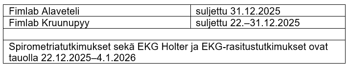 Fimlabin palvelupisteissä Pohjanmaan alueella on seuraavat poikkeavat aukiolot jouluna ja vuodenvaihteessa 2025: Muut palvelupisteemme toimivat joulun aikaan normaalisti aukioloaikojensa puitteissa. Huomioithan, että kaikki palvelupisteemme ovat suljettuina jouluaattona 24.12.2025, uudenvuodenpäivänä 1.1.2026 ja loppiaisena 6.1.2026. Ajantasaiset aukioloajat löytyvät aina osoitteesta fimlab.fi/palvelupisteet-ja-aukioloajat/ .Ajanvaraus: netissä fimlab.fi/ajanvaraus tai soittamalla numeroon 010 808 515 arkisin ma-pe klo 7–16. [...]