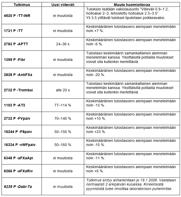 Tampereen keskuslaboratorion hyytymäanalytiikassa käytettävä laitteisto vaihtuu 26.1.2026. Laite- ja menetelmämuutoksesta johtuen viitevälit vaihtuvat osassa tutkimuksista (kts. taulukko). Tutkimusten nimet ja numerot säilyvät ennallaan, samoin 24/7-saatavuus.