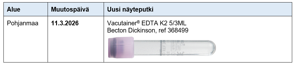 Käytössä oleva näyteputki tutkimukselle B -La (2203) muuttuu laitteistouudistuksen vuoksi 11.3.2026 alkaen.