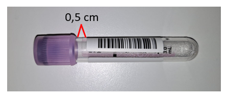 Putkimuutoksen lisäksi myös putken tarroitustapa muuttuu entistä kriittisemmäksi. Oikea tarroitustapa on kuvattu alla. Tarra tulee kiinnittää putkeen suoraan ja sen yläpuolelle korkin alle tulee jäädä tilaa n. 0,5 cm. Tällöin laitteisto tunnistaa näytepinnan oikein ja analysointi onnistuu ilman uudelleentarroitusta.