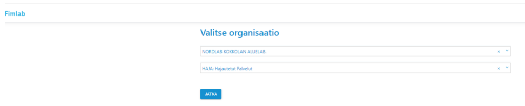 3. Onnistuneen tunnistautumisen jälkeen järjestelmä pyytää valitsemaan käyttäjän laitoksen ja toimipisteen. Laitos-listauksessa näkyvät kaikki laitokset, joihin käyttäjällä on pääsyoikeudet. Valitse laitos, jolla haluat jatkaa.