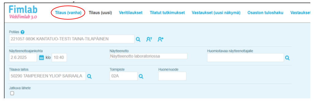 Jatkossa jos sinulla on tarve päästä WebFimlabin vanhaan versioon, esimerkiksi tiedetilauksia tai kestolähetteitä varten, voit vaihtaa vanhaan versioon kuvaan merkityn Tilaus (vanha) -toiminnon kautta: