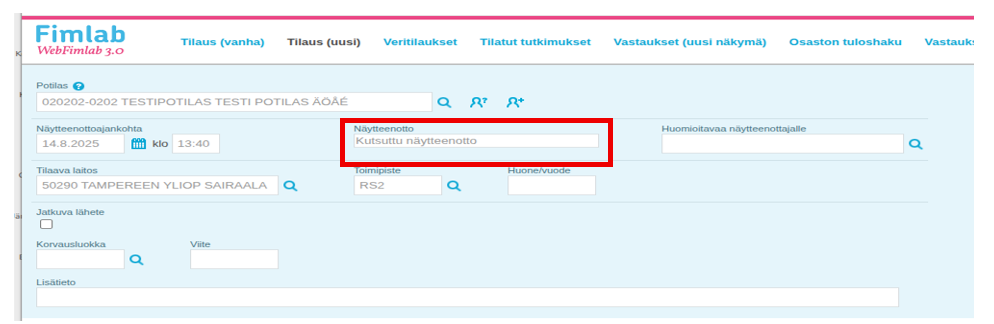 Valitse Tutkimusten tilaus -näkymän Näytteenotto-kohdassa ”Kutsuttu näytteenotto”: