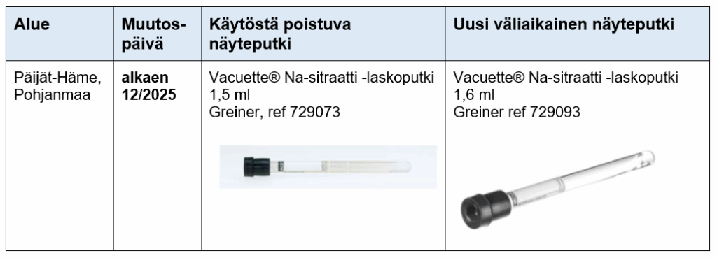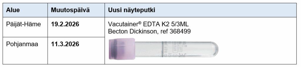 Laitteistouudistuksen vuoksi näyteputki vaihtuu keväällä 2026 uudelleen. Uudistuksen jälkeen tutkimuksen voi analysoida ainoastaan alla olevassa taulukossa kuvatusta uudesta näyteputkesta. Tämän vuoksi käytöstä poistuvat näyteputket on hävitettävä muutosaikataulun mukaisesti kaikista näytteenottopisteistä sekä hoito- ja hoivayksiköistä.