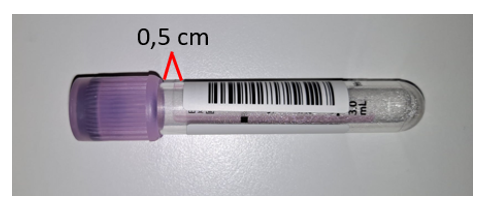Putkimuutoksen lisäksi myös putken tarroitustapa muuttuu entistä kriittisemmäksi. Oikea tarroitustapa on kuvattu alla. Tarra tulee kiinnittää putkeen suoraan ja sen yläpuolelle korkin alle tulee jäädä tilaa n. 0,5 cm. Tällöin laitteisto tunnistaa näytepinnan oikein ja analysointi onnistuu ilman uudelleentarroitusta.