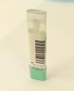 Hoitoyksiköissä tulostetut viivakoodilliset ja näytenumerolliset tarrat tulee asettaa OC-auto sampling bottle 3 -näyteastiaan kuvan mallin mukaisesti. Viivakoodi asetetaan putken litteään osaan siten, että teksti on ylöspäin ja putken vihreä korkki jää alas.