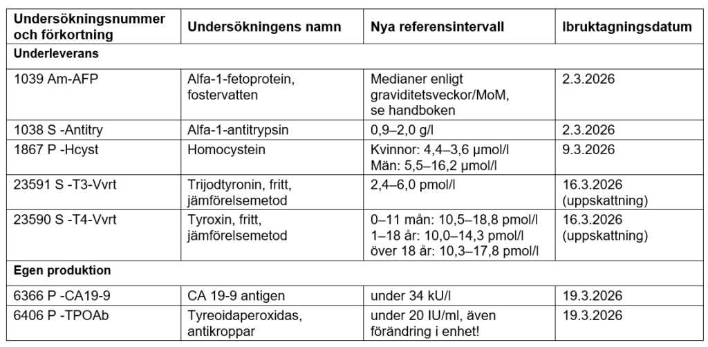 I underleverantörsundersökningarna Am-AFP, S -Antitry, P -Hcyst, S -T3-Vvrt och S -T4-Vvrt har det skett eller ska de ske förändringar i referensintervallen på grund av det stegvisa utrustningsbytet vid provtagningsstället. Det beräknade datumet för den sist nämnda undersökningen kan ännu ändra något. I resultatets utlåtandefält ska man under 2 månaders tid lägga till information om när förändringen i referensintervallet har trätt i kraft. Metoderna förblir desamma.