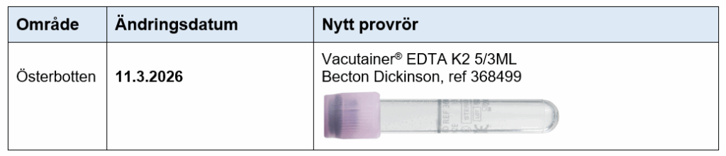 På grund av ny apparat kommer provröret att bytas ut igen i mars 2026. Efter uppdateringen kan undersökningen endast analyseras från det nya provröret som beskrivs i tabellen nedan. Därför måste provrör som inte längre används kasseras vid alla provtagningspunkter samt vårdenheter.