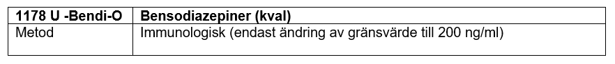 Gränsvärdet för ett positivt testresultat för U-Bendi-O som ingår i undersökningen 4221 U-Huum-O kommer att vara 200 ng/ml från och med 17.6.2025 istället för 100 ng/ml som användes tidigare. Med förändringen förbättrar man exaktheten i screeningen och förenhetligar testningspraxisen. Ett falskt positivt screeningresultat för bensodiazepiner kan orsakas i synnerhet av sertralinmedicinering, vars effekt kan minskas genom att utföra den övervakade provtagningen så nära resthalten som möjligt. Quetiapin stör inte längre metoden märkbart efter att gränsvärdet höjdes även om det för närvarande har konstaterats vara en bakgrundsfaktor i en del av utredningarna där screeningen av besodiazepiner har varit positiv och det bekräftande testet negativt.