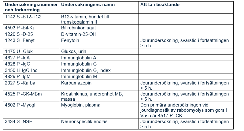 Om svaret behövs under samma dygn, ska proverna hinna till den tidigare transporten och vara i laboratoriet på Vasa centralsjukhus senast kl. 11.30 på vardagar. Prover i den senare transporten som lämnats in till centralsjukhusets laboratorium senast kl. 15.30 på vardagar besvaras senast nästa dag. Snabbare specialtransport på grund av jourbehov och på veckoslut avtalas separat med laboratoriet.